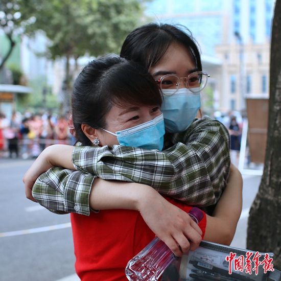 7月7日上午,四川省成都市,成都七中考點(diǎn)門(mén)口,一名考生進(jìn)入考場(chǎng)前與老師擁抱。汪龍華/攝