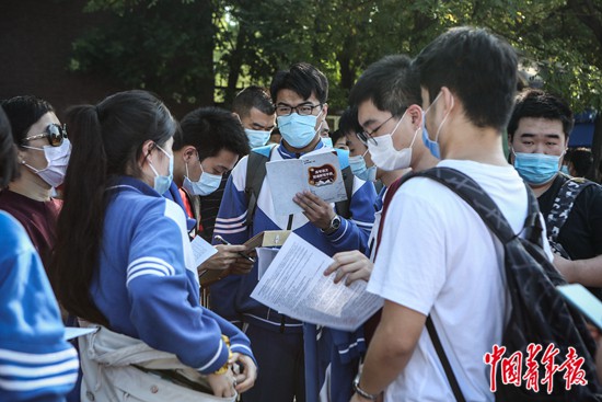 7月7日上午,北京市中國(guó)人民大學(xué)附屬中學(xué)朝陽(yáng)學(xué)校(東校區(qū))門(mén)口,考生們?cè)谶M(jìn)入考場(chǎng)前抓緊時(shí)間看復(fù)習(xí)資料。中青報(bào)·中青網(wǎng)見(jiàn)習(xí)記者 孔斯琪/攝