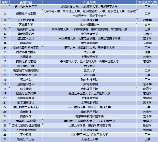這也是近3年來新增本科專業(yè)較多的一次。記者梳理發(fā)現(xiàn),29種新專業(yè)涉及19個大類,其中交叉工程類、醫(yī)學(xué)技術(shù)類、戲劇與影視學(xué)類較多。