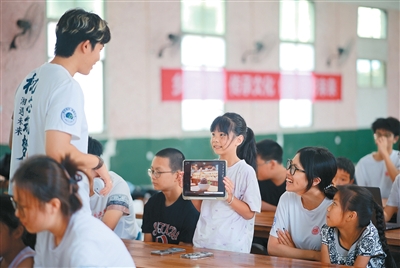 湖南省懷化市通道侗族自治縣萬佛山鎮(zhèn)木腳村,大學(xué)生在給孩子們上趣味AI實驗課。李尚引攝(人民視覺)