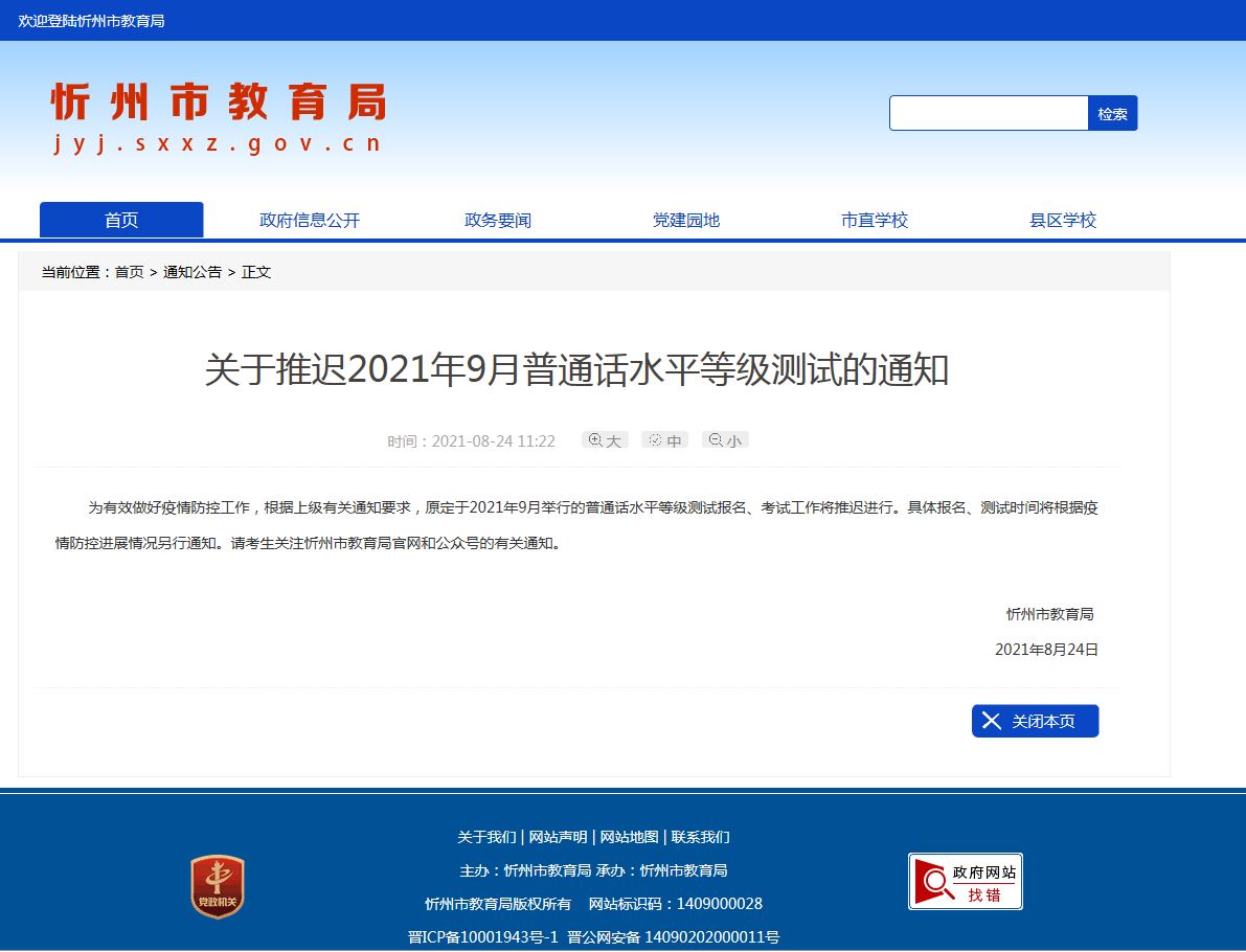 為有效做好疫情防控工作,根據(jù)上級有關通知要求,原定于2021年9月舉行的普通話水平等級測試報名、考試工作將推遲進行。具體報名、測試時間將根據(jù)疫情防控進展情況另行通知。請考生關注忻州市教育局官網和公眾號的有關通知。