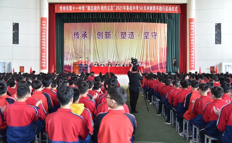 又是一年五月,陽光明媚,又逢“五四”,血脈僨張。在五月的花海中擁抱青春的時代,在初升的太陽下點燃生命的未來。為進一步激發(fā)初三師生堅定目標、奮力拼搏、沖刺中考的雄心壯志,5月4日上午,忻州市第十一中學初三年級全體師生在學校文體藝苑舉行了“勵志相約、相約立志”2021屆備戰(zhàn)中考50天沖刺牽手踐行啟動儀式,校長張云長、黨支部書記趙智剛、學校領導、部分家長代表共同見證了這一振奮人心的時刻。