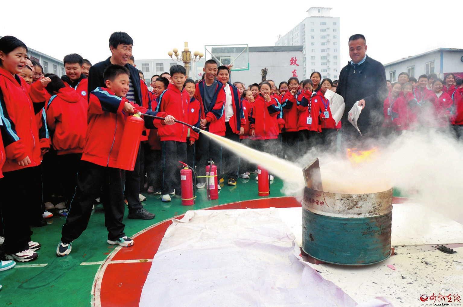 為了提升學(xué)?;馂?zāi)疏散組織和管理能力,強(qiáng)化師生安全意識(shí),培養(yǎng)師生的自救能力,10月31日,忻州市第七中學(xué)舉行消防應(yīng)急疏散演練。圖為學(xué)生使用滅火器滅火。(張卯芳 攝