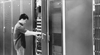 在東南亞電信(柬埔寨)有限公司建設(shè)的云數(shù)據(jù)中心里,工作人員正在調(diào)試設(shè)備。本報(bào)記者 張志文攝