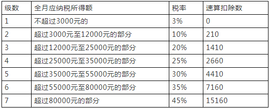 注意稅率表里有一欄“速算扣除數(shù)”。速算扣除數(shù)是指為解決超額累進(jìn)稅率分級(jí)計(jì)算稅額的復(fù)雜技術(shù)問題,而預(yù)先計(jì)算出的一個(gè)數(shù)據(jù)。