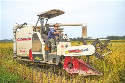 我國糧食產(chǎn)量連續(xù)6年保持在1.3萬億斤以上,與農(nóng)業(yè)現(xiàn)代化和土地充分利用密不可分。圖為今年秋季一名農(nóng)民駕駛收割機在海南??邶埲A區(qū)龍泉鎮(zhèn)新江村收割晚稻。新華社記者 蒲曉旭攝