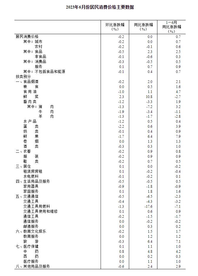 2023年6月份,全國居民消費價格同比持平。其中,城市持平,農(nóng)村下降0.1%;食品價格上漲2.3%,非食品價格下降0.6%;消費品價格下降0.5%,服務(wù)價格上漲0.7%。1--—6月平均,全國居民消費價格比上年同期上漲0.7%。