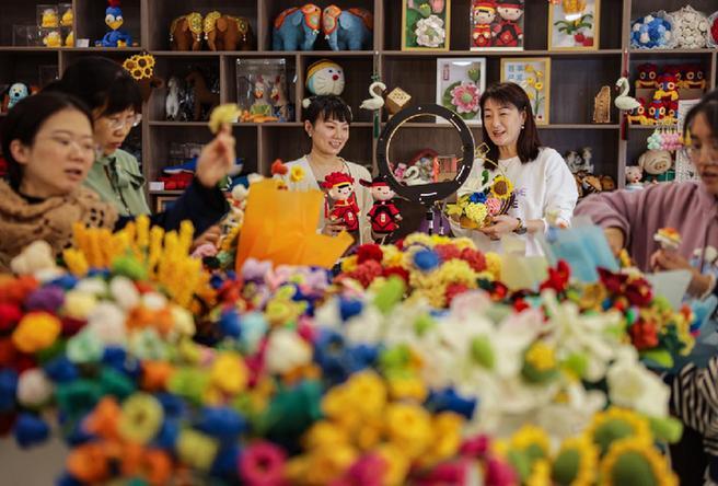 2023年11月9日,山東省榮成市巾幗創(chuàng)業(yè)孵化基地,婦女創(chuàng)客在包裝毛線編織手辦、花束訂單,迎接“雙十一”購(gòu)物高峰。新華社發(fā)(李信君 攝)