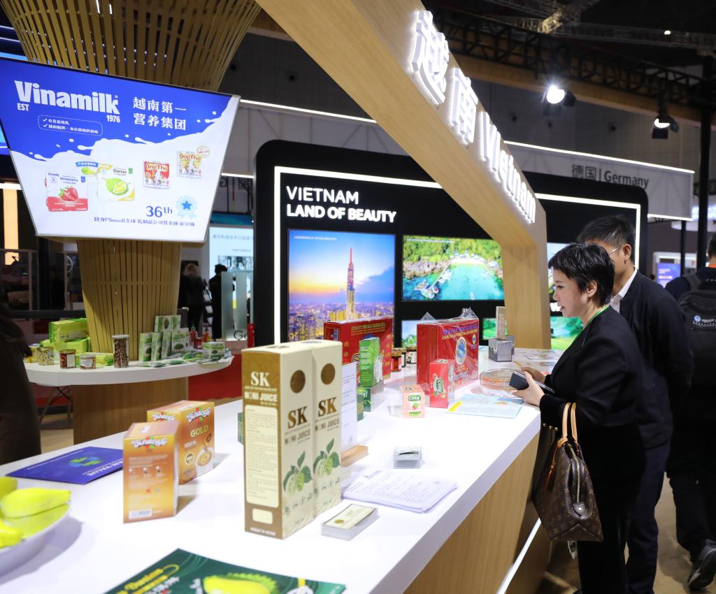 11月6日,參觀者在第六屆進(jìn)博會(huì)國(guó)家展越南展臺(tái)挑選商品。