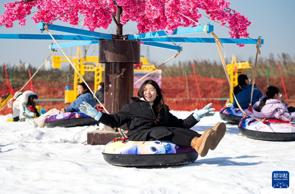 1月19日,在邯鄲市復(fù)興區(qū)東高河村滑雪場(chǎng),游客在體驗(yàn)滑雪圈項(xiàng)目。