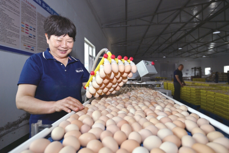 在雞舍集蛋臺(tái)前檢驗(yàn)雞蛋。