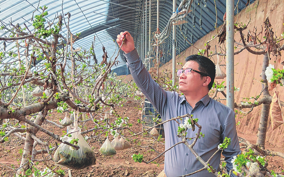 婁淵斌正在檢查車?yán)遄訕溟_花情況。本報(bào)記者暢雪攝