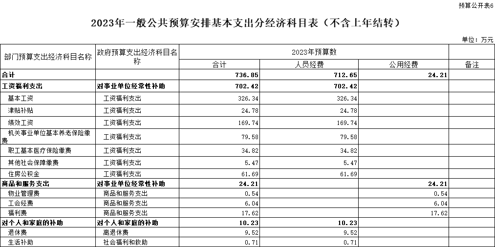 基本支出736.85萬元,比2022年增加10.69萬元,基本支出系按現(xiàn)有人員工資標(biāo)準(zhǔn)和公共經(jīng)費定額標(biāo)準(zhǔn)核定,主要用于保障機(jī)關(guān)正常運轉(zhuǎn)、完成日常工作任務(wù)而發(fā)生的各項支出。其中:工資福利支出702.42萬元,對個人和家庭的補(bǔ)助支出10.23萬元,公用經(jīng)費項目24.21萬元。