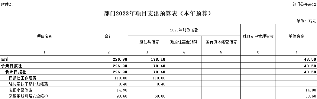 2、部門預(yù)算單位構(gòu)成:忻州日報社是一級預(yù)算單位,無下屬單位。部門預(yù)算只有一個單位,即忻州日報社。