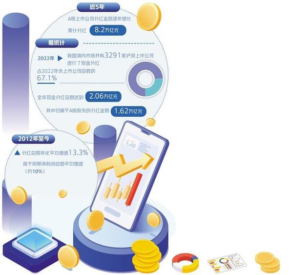 近5年,A股上市公司分紅金額逐年增長,累計分紅8.2萬億元。據(jù)統(tǒng)計,2022年,我國境內(nèi)市場共有3291家滬深上市公司進行了現(xiàn)金分紅,占2022年末上市公司總數(shù)的67.1%,全年現(xiàn)金分紅總額達到2.06萬億元,其中歸屬于A股股東的分紅金額1.62萬億元。國際比較來看,境內(nèi)市場分紅上市公司數(shù)量在全球主要證券市場中位居第一,現(xiàn)金分紅總額位列全球第二,分紅家數(shù)占比位列全球第二。此外,有163家上市公司公布2023年半年報現(xiàn)金分紅預案,預計分紅2030.1億元。