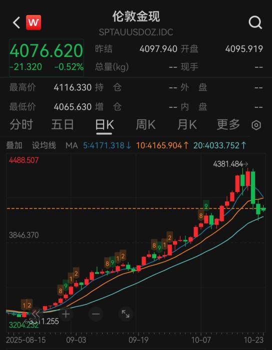 10月22日,倫敦現(xiàn)貨黃金價格盤中逼近每盎司4000美元。23日亞洲早盤時段,倫敦現(xiàn)貨黃金為每盎司4090美元左右。