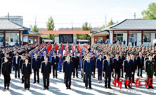 忻州市革命烈士陵園內(nèi),翠柏列陣,巍然聳立的紀(jì)念碑上“革命烈士永垂不朽”八個(gè)大字蒼勁有力。廣場上,部隊(duì)官兵、武警官兵、公安干警、應(yīng)急民兵、學(xué)校師生、機(jī)關(guān)干部、社會(huì)團(tuán)體和志愿者代表等社會(huì)各界人士整齊列隊(duì),靜靜肅立。市委、市人大、市政府、市政協(xié)、忻州軍分區(qū),忻府區(qū)委、區(qū)人大、區(qū)政府、區(qū)政協(xié),人民團(tuán)體和各界群眾敬獻(xiàn)的花籃依次擺放在紀(jì)念碑基座前廣場上。