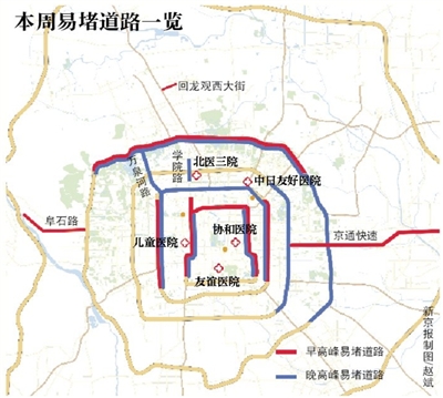隨著近期氣溫下降,感冒等季節(jié)性疾病高發(fā),各大醫(yī)院就診人數(shù)增多,朝陽安貞地區(qū)、西城月壇地區(qū)、東城王府井地區(qū)的交通壓力較大,預計工作日上午時段,兒童醫(yī)院、協(xié)和醫(yī)院、中日友好醫(yī)院、友誼醫(yī)院、北醫(yī)三院等醫(yī)院就診人數(shù)增多,周邊交通壓力較大。
