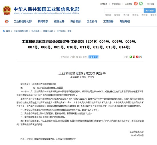 經(jīng)濟(jì)日報(bào)-中國經(jīng)濟(jì)網(wǎng)10月8日訊(記者 郭躍)今日,工業(yè)和信息化部(以下簡稱“工信部”)發(fā)布公告,對11家不符合《道路機(jī)動車輛生產(chǎn)企業(yè)及產(chǎn)品公告》(以下簡稱《公告》)管理中關(guān)于生產(chǎn)一致性管理相關(guān)規(guī)定的公司進(jìn)行行政處罰。處罰內(nèi)容包括停止以上11家公司生產(chǎn)和銷售違規(guī)產(chǎn)品,并撤銷產(chǎn)品《公告》;責(zé)成以上公司進(jìn)行為期6個月的整改;同時,整改期間暫停公司《公告》新產(chǎn)品申報(bào)資格。