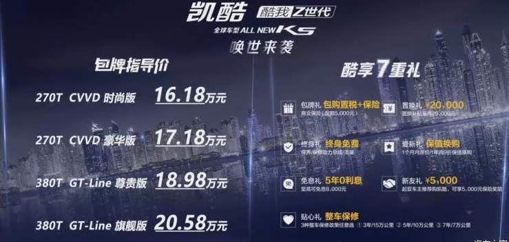 另據(jù)了解,新車指導(dǎo)價格區(qū)間為16.18-20.58萬元。起亞將這個價格稱為包牌價,是因?yàn)榘ㄙ徶枚惡妥罡?000元保險。根據(jù)官方公布的信息,截止9月6日,全新K5凱酷已經(jīng)收獲10615輛訂單。