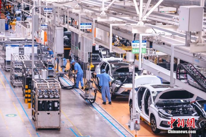 圖為上汽集團寧德基地總裝車間內(nèi),工人在新能源汽車生產(chǎn)線上作業(yè)。李南軒 攝
