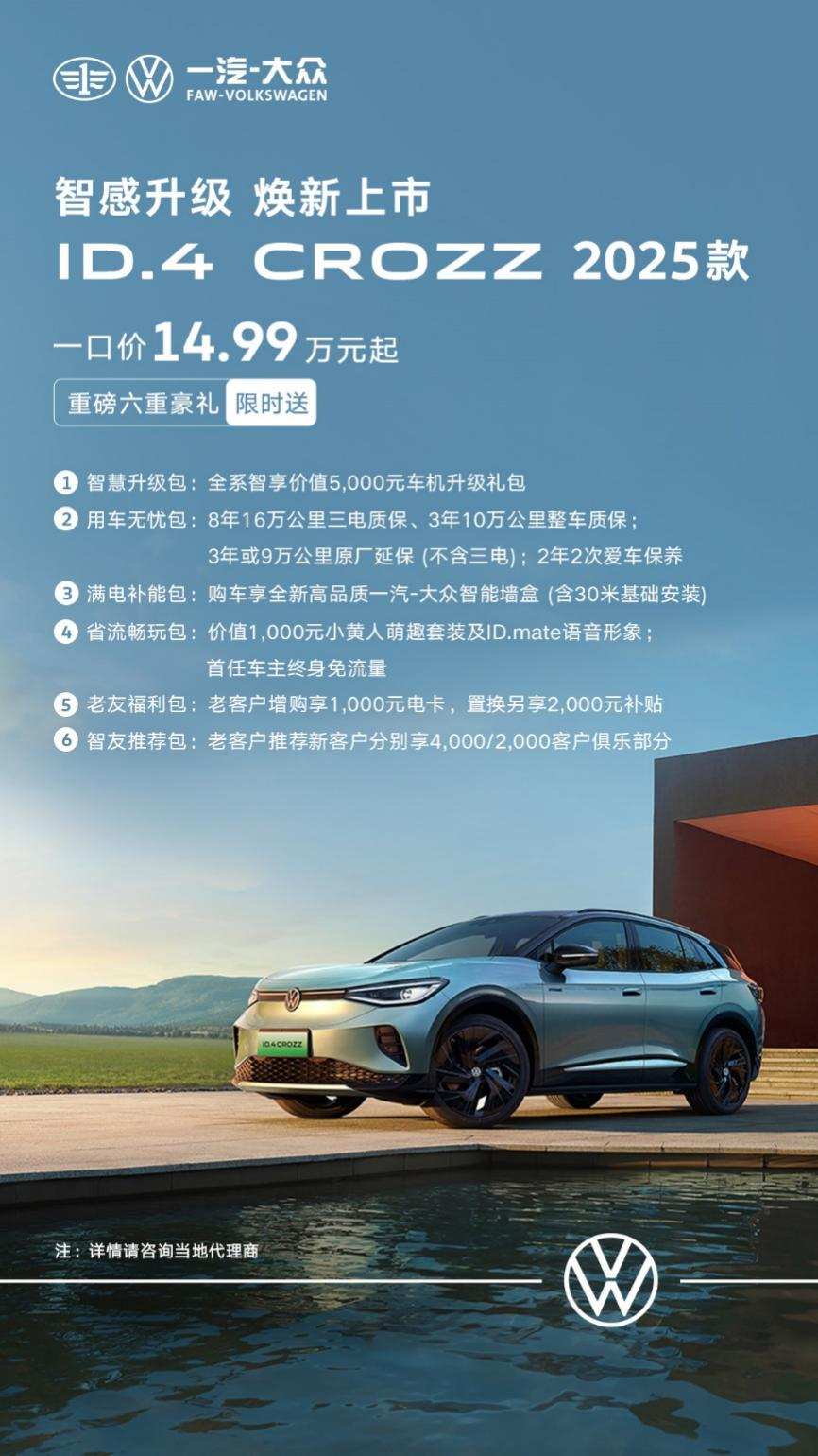 一汽-大眾ID.4 CROZZ作為MEB專屬純電平臺打造的純電汽車產(chǎn)品,憑借超高標準的整車安全、純正德系操控、真實續(xù)航及舒享空間,深受消費者喜愛。隨著2025款產(chǎn)品的推出,一汽-大眾ID.4 CROZZ將繼續(xù)為用戶提供更安全、更可靠、更智能的電動出行體驗,共同開啟更加美好的出行新世界。