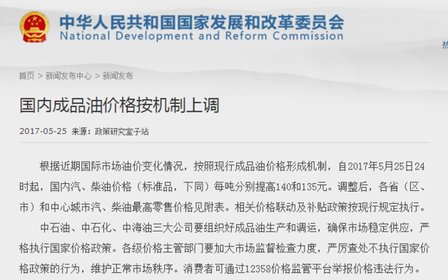 昨日(25日),國家發(fā)展和改革委員會發(fā)布消息稱,根據(jù)近期國際市場油價變化情況,按照現(xiàn)行成品油價格形成機(jī)制,自2017年5月25日24時起,國內(nèi)汽、柴油價格(標(biāo)準(zhǔn)品,下同)每噸分別提高140和135元。相關(guān)價格聯(lián)動及補(bǔ)貼政策按現(xiàn)行規(guī)定執(zhí)行。