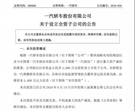 一汽轎車股份有限公司關(guān)于設(shè)立全資子公司的公告