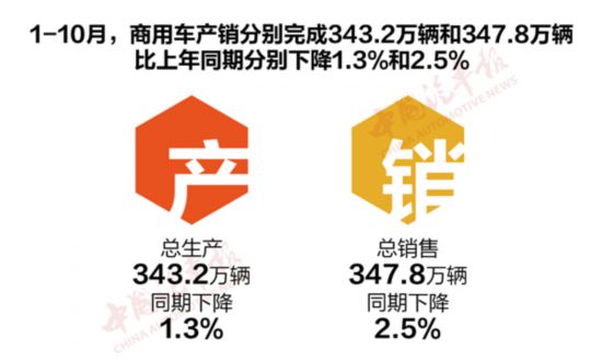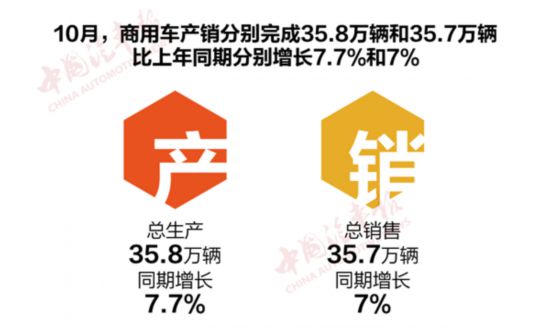 11月11日,中國(guó)汽車工業(yè)協(xié)會(huì)發(fā)布10月汽車產(chǎn)銷數(shù)據(jù)。商用車產(chǎn)銷分別完成35.8萬(wàn)輛和35.7萬(wàn)輛,比上月分別增長(zhǎng)3.9%和4.8%,比上年同期分別增長(zhǎng)7.7%和7%,與乘用車市場(chǎng)的“一片涼涼”相比,商用車產(chǎn)銷數(shù)據(jù)表現(xiàn)亮眼,市場(chǎng)加速回暖。