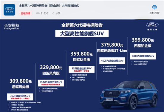 作為長安福特“大型高端旗艦SUV”,全新第六代福特探險(xiǎn)者共推出5款車型,售價(jià)區(qū)間為30.98萬-39.98萬元,全系支持6座或7座布局選擇。