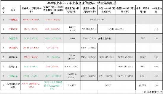 2020年上半年主要卡車上市企業(yè)業(yè)績及銷量情況