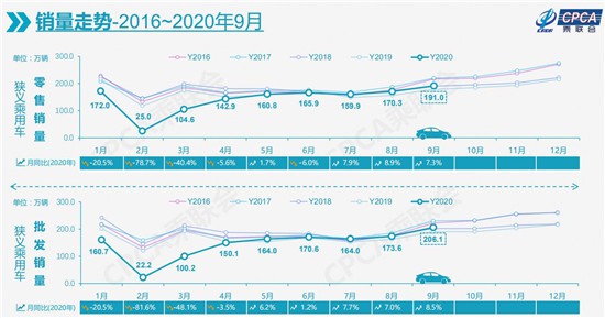 9月,國內(nèi)狹義乘用車銷量達(dá)到191.0萬輛,同比增長7.3%,三季度較去年同期實現(xiàn)約38萬輛的銷售增量;1-9月累計銷量增速下滑也收窄至12.5%,較1-8月再提升2.7個百分點。國內(nèi)乘用車市場繼續(xù)呈現(xiàn)較強(qiáng)的回暖趨勢。