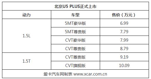 9月23日,北京U5 PLUS正式上市,售價區(qū)間為6.99-10.09萬元。北京U5 PLUS是北京U5的中期改款車型,新車在名字后面加了一個PLUS后綴。北京U5 PLUS配備了最新的北京汽車LOGO,外觀設計更加年輕化、內飾科技感更足。詳細售價請見下表: