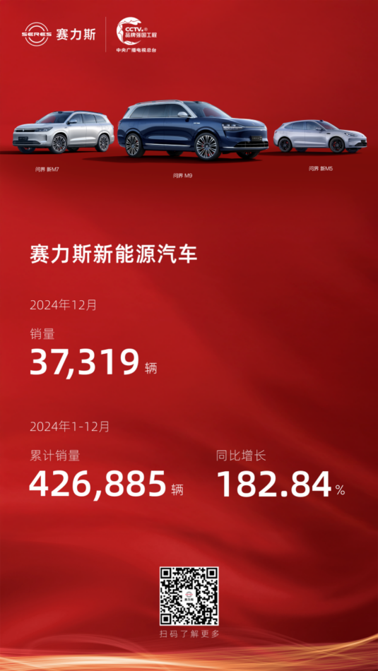 2025年1月1日,賽力斯發(fā)布2024年12月產(chǎn)銷快報。數(shù)據(jù)顯示,賽力斯12月新能源汽車銷量達(dá)37319輛;1-12月新能源汽車?yán)塾嬩N量達(dá)426885輛,同比增長182.84%。