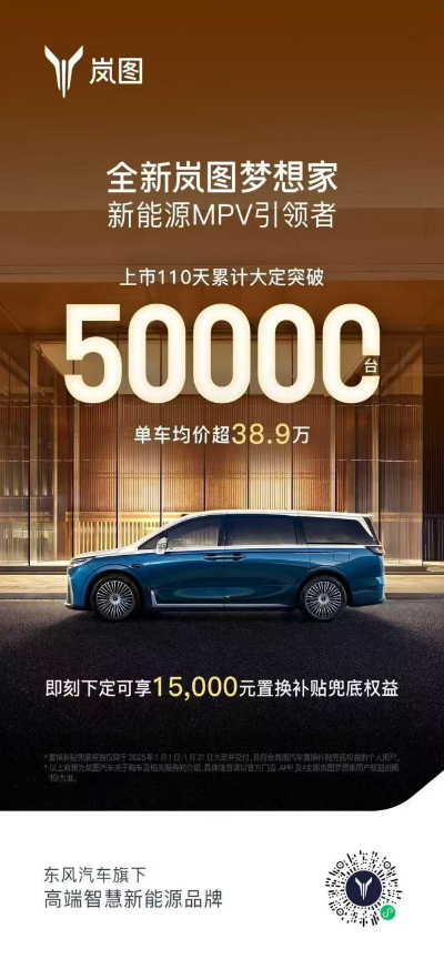 作為嵐圖汽車的“明星產(chǎn)品”,全新嵐圖夢想家的市場表現(xiàn)可圈可點(diǎn)。去年9月19日,全新嵐圖夢想家正式上市,不僅助推嵐圖汽車當(dāng)月銷量突破萬輛,且后續(xù)幾個(gè)月延續(xù)熱銷態(tài)勢。10-11月蟬聯(lián)新能源MPV銷量冠軍,12月單一車型銷量突破萬輛,上市110天累計(jì)大定更是突破5萬臺,創(chuàng)造了歷史,也使得嵐圖汽車坐穩(wěn)月銷過萬的“寶座”,駛?cè)敫哔|(zhì)量發(fā)展快車道。