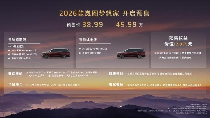 8月29日,第二十八屆成都國際汽車展覽會(huì)盛大開幕。全面煥新升級(jí)的“新時(shí)代旗艦MPV”2026款嵐圖夢(mèng)想家預(yù)售亮相。本次新車共推出智能超混版和智能純電版兩個(gè)動(dòng)力版本,預(yù)售價(jià)為38.99萬-45.99萬,同步推出了價(jià)值超萬元的多項(xiàng)重磅權(quán)益,包括2000元抵5000元尾款的膨脹金,終身免費(fèi)三電質(zhì)保、終身免費(fèi)基礎(chǔ)保養(yǎng)和優(yōu)先交付提車。9月1日起,2026款嵐圖夢(mèng)想家展車、試駕車將陸續(xù)到店,消費(fèi)者可以進(jìn)店親自體驗(yàn)新車的獨(dú)特魅力。