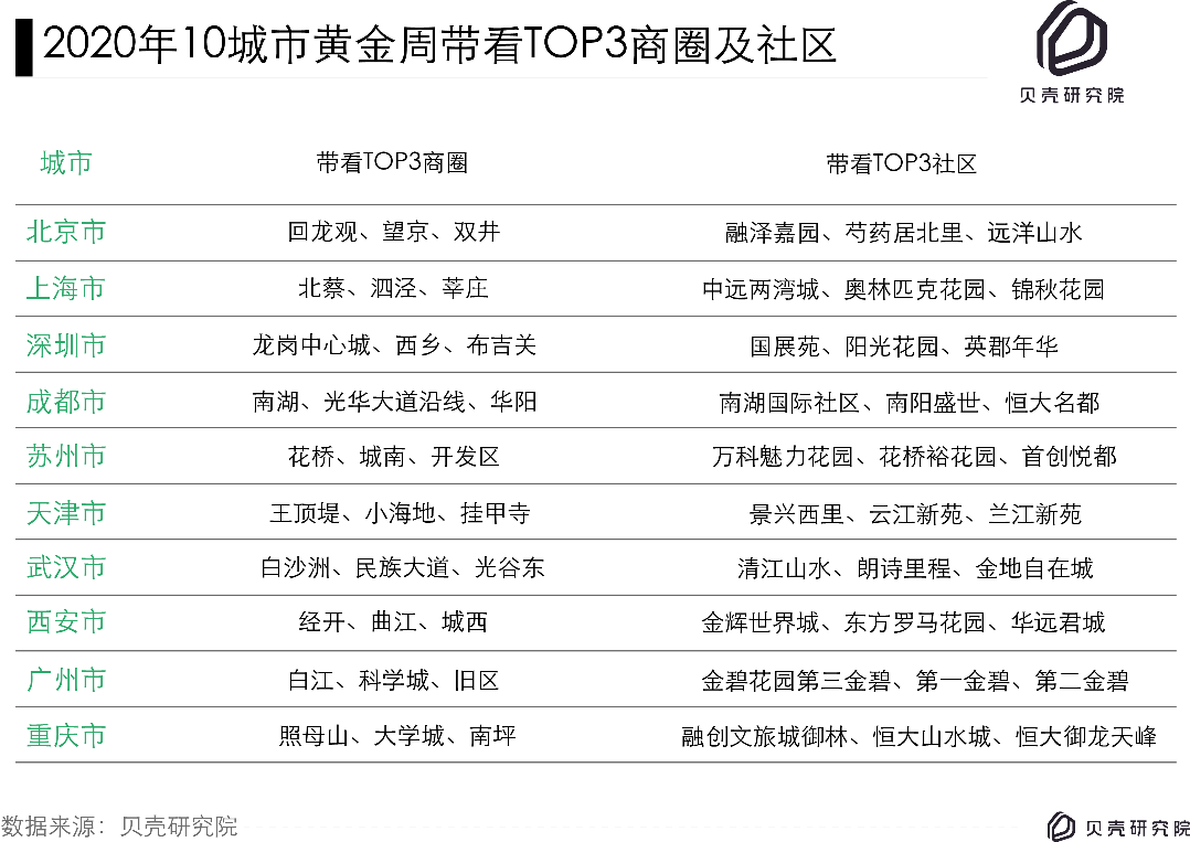 同樣,每個(gè)城市都有熱門(mén)商圈與人氣社區(qū)。此次,貝殼研究院特別梳理出2020年黃金周期間帶看量最高的十個(gè)城市,并找到其熱門(mén)商圈和社區(qū)。以城市帶看龍頭北京為例,回龍觀、望京、雙井商圈帶看熱度高,排名城市商圈TOP3;而融澤嘉園、芍藥居北里、遠(yuǎn)洋山水三個(gè)社區(qū)帶看熱度在社區(qū)榜中關(guān)注度最高。