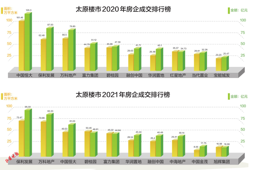 同時,2020年排名第一的中國恒大,在太原的年銷售額超過了120億元;2021年排名第一的保利發(fā)展銷售額為95.33億元,沒有跨過百億門檻。在成交面積方面,恒大2020年的總銷售面積超過了100萬平方米,而2021年保利發(fā)展的總銷售面積為73.47萬平方米,比上一年的銷售面積冠軍縮水了近三成。
