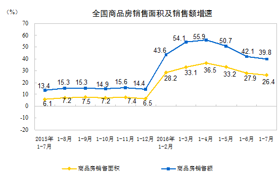 1-7月份,商品房銷售面積75760萬平方米,同比增長26.4%,增速比1-6月份回落1.5個(gè)百分點(diǎn)。其中,住宅銷售面積增長26.7%,辦公樓銷售面積增長41.3%,商業(yè)營業(yè)用房銷售面積增長15.5%。商品房銷售額57569億元,增長39.8%,增速回落2.3個(gè)百分點(diǎn)。其中,住宅銷售額增長41.2%,辦公樓銷售額增長65.3%,商業(yè)營業(yè)用房銷售額增長17.6%。