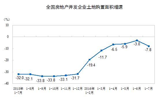 1-7月份,房地產(chǎn)開發(fā)企業(yè)土地購置面積11167萬平方米,同比下降7.8%,降幅比1-6月份擴(kuò)大4.8個(gè)百分點(diǎn);土地成交價(jià)款3848億元,增長7.1%,增速回落3.1個(gè)百分點(diǎn)。