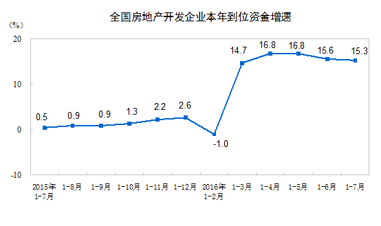 1-7月份,房地產(chǎn)開發(fā)企業(yè)到位資金79881億元,同比增長15.3%,增速比1-6月份回落0.3個(gè)百分點(diǎn)。其中,國內(nèi)貸款12605億元,增長0.7%;利用外資93億元,下降49.8%;自籌資金27877億元,增長0.4%;其他資金39307億元,增長36.3%。在其他資金中,定金及預(yù)收款22321億元,增長31.6%;個(gè)人按揭貸款13305億元,增長54.6%。