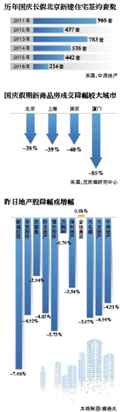 北京在9月30日出臺(tái)的政策影響了市場(chǎng)熱度,市場(chǎng)進(jìn)入了急速冷凍階段。中原地產(chǎn)研究中心統(tǒng)計(jì)數(shù)據(jù)顯示,2016年國(guó)慶長(zhǎng)假期間,7天北京新建住宅簽約216套,二手房住宅簽約209套。合計(jì)簽約425套。而2015年國(guó)慶7天簽約為543套。從簽約數(shù)據(jù)看,北京新建住宅成交量為2011年來6年最低點(diǎn)。對(duì)此,中原地產(chǎn)首席分析師張大偉分析認(rèn)為,預(yù)計(jì)北京房?jī)r(jià)將快速降溫,四季度漲幅將明顯放緩,在自住房大量供應(yīng)后,部分區(qū)域的價(jià)格很可能出現(xiàn)調(diào)整。
