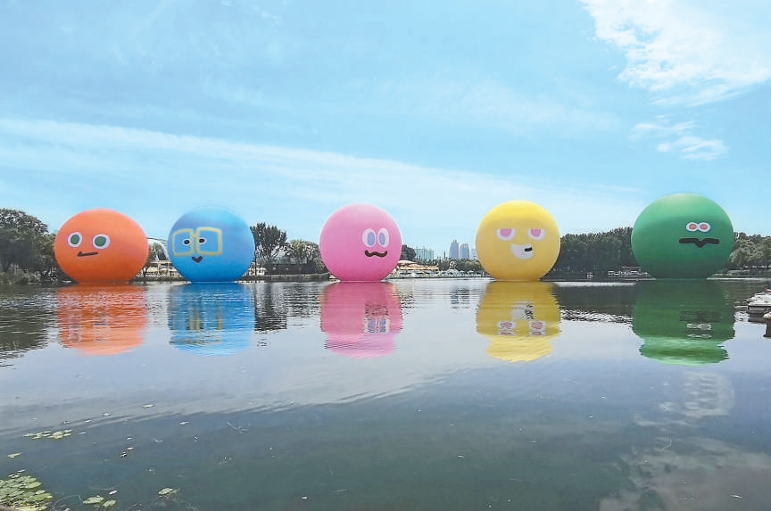 近日,朝陽公園北碼頭附近的湖面上新添五個10米高的充氣大球,粉色、黃色、綠色等不同顏色,對應(yīng)的是樂隊組合五月天的不同成員,也與今年7月25日至8月9日,五月天在鳥巢舉辦演唱會的舞臺裝置遙相呼應(yīng)。與此同時,樂隊成員的人物公仔也分別放置在居庸關(guān)長城、首鋼園、鼓樓廣場、798·751藝術(shù)區(qū)、亮馬河畔等地標景點。