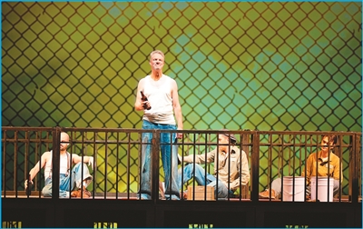演出開場,鐵絲網(wǎng)幕在昏暗的冷光里升起,囚犯們在鐵籠里形如困獸。這一場景勾勒出肖申克監(jiān)獄的陰森可怖,壓迫感令人屏息。遇到暴力沖突時(shí),血紅色燈光瞬間籠罩舞臺(tái),渲染出緊張氛圍。每逢監(jiān)獄操場上的閑談時(shí)刻,暖黃色燈光灑下,幕布上的高墻外飄著幾行疏云,透出難得的安適。