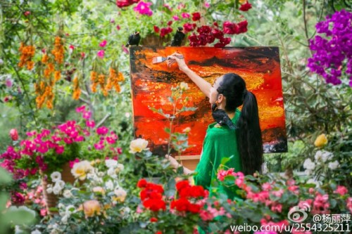 13日,舞蹈家楊麗萍在微博曬出一組自己在花園中作畫的照片。只見楊麗萍民族風(fēng)裝扮,而她所在的周圍鮮花滿布,姹紫嫣紅,還不時(shí)地有幾只鳥落在身旁,好似人間仙境。