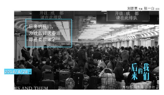 在監(jiān)制張一白的助力下,電影不但真實的還原春運的場景,火車更成為男女主人公的初遇邂逅之地。預告片以周冬雨扮演的小曉在冰天雪地的回家的路上,一聲〝最恨春節(jié)〞的臺詞起始,最后落在男主角井柏然飾演的見清撿起她的車票收尾。期間,在黑白的電影畫面里,漂泊的人們步履匆匆,扛著大包小包匆忙的走向站臺,火車上人頭攢動,直到周冬雨與井柏然的邂逅讓畫面充滿了色彩。勾起了觀眾對兩位主人公接下來的人生命運和情感經歷將如何發(fā)展的好奇心。