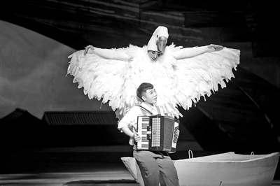 最具情趣的莫過于由北京京劇院武丑演員曹陽陽帶領一眾北戲學生演出的大鵝,身披潔白羽毛憨態(tài)可掬。這也是曹陽陽從藝以來第一次在舞臺上以動物的形態(tài)進行表演。這個與主角林大林互動最多的角色,既要化身林大林渴望的父愛,又是他孤單時的玩伴。在模仿大鵝走路的過程中,曹陽陽便用上了京劇武丑的技巧。其中一場水中救人的段落,他甚至還要從兩米多高的橋上展開翅膀飛身下去,對京劇下高、空翻技巧有了全新的展示。