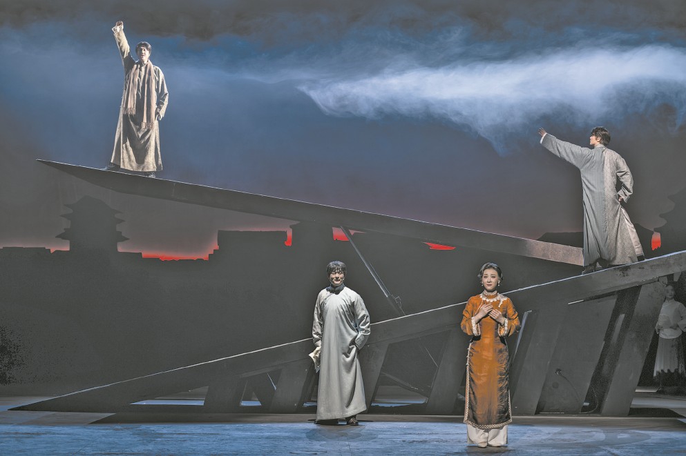 “青春是混沌初開,青春是綻放花苞”,《延年和喬年》序幕中的詠嘆奠定了作品浪漫主義的色彩。黃梅戲唱腔質樸流暢,《延年和喬年》并沒有選擇用高亢激昂的曲風來演繹革命題材,而是從劇種特色出發(fā),注重刻畫兄弟兩人的精神世界和情感故事?!把訂绦值軐τ诎矐c來說,不僅是革命者,更是這座城的兒女,這里的人們對于他們有著深厚的愛戴和敬仰。所以在創(chuàng)作之初,我就決定一定要寫情,以情動人,在情之中尋找立意,這是創(chuàng)作的根本?!本巹∮鳂s軍說。
