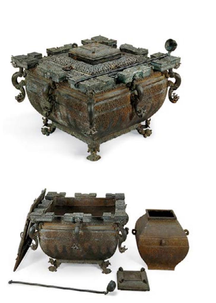 影片中用于冰酒的銅鑒缶正是出自于湖北省博物館館藏曾侯乙銅鑒缶,它由外部的鑒、鑒內(nèi)置的缶組成,是中國(guó)最早的“冰箱”。在鑒的內(nèi)部放上缶,中間的空隙放上冰塊,可在祭祀和宴饗時(shí)冰鎮(zhèn)酒?!耙怨艦殍b”“擊缶而歌”等成語(yǔ)亦由此衍生而來(lái)。