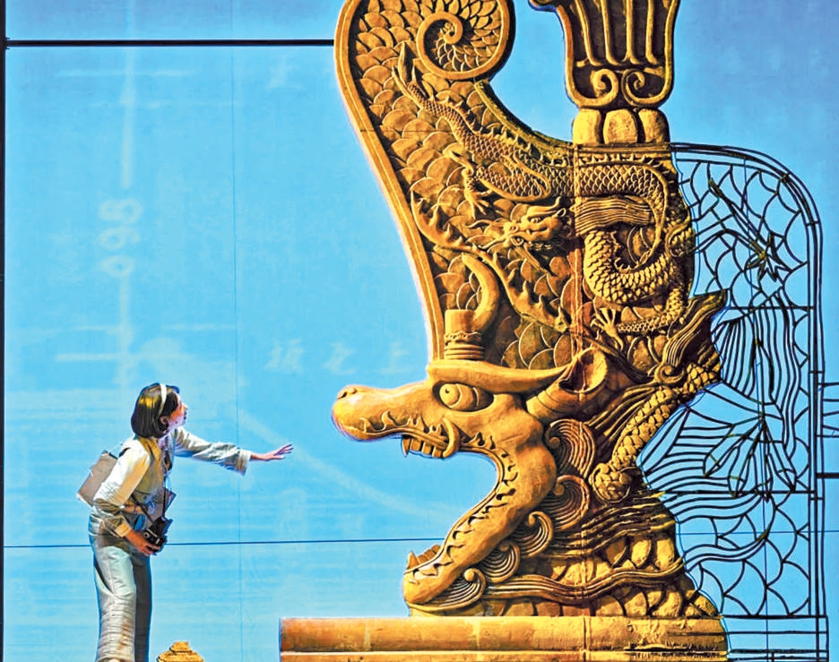 王琛透露,舞臺上關(guān)鍵的古建筑構(gòu)件均嚴(yán)格按照1∶1的真實比例復(fù)原制作,當(dāng)它們懸置于觀眾面前,一種視覺上的“沖擊力”油然而生,“觀眾能直觀體會到劇中人物每日工作的物理尺度和精神重量,體會測繪隊員是以怎樣的血肉之軀攀爬、丈量并挽留這份巍峨的文明。”舞臺地面,北平時期中軸線的建筑脈絡(luò)化為起伏線條,如紙張般弧形掀起,“寓意著古城文明在戰(zhàn)火中飄搖欲飛卻又根基深植的命運。建筑的‘實’代表文明遺產(chǎn),圖紙的‘虛’代表傳承意志,虛實明暗的銜接過渡,共同凝固了那段驚心動魄的歷史?!保ㄓ浾?高倩)